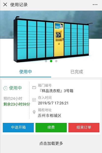 取物時,掃屏幕二維碼進入公眾號內(nèi),點擊“取物”按鈕(如圖1-3所示),點擊“取物”按鈕后,將出現(xiàn)如圖1-4所示界面,客戶可以根據(jù)需求點擊“中途取物”或者“結(jié)束訂單”,點擊“結(jié)束訂單”后,箱門打開,請取走所有物品。點擊“中途取物”后,此箱門還屬客戶,客戶還可以繼續(xù)存物或者取物。
