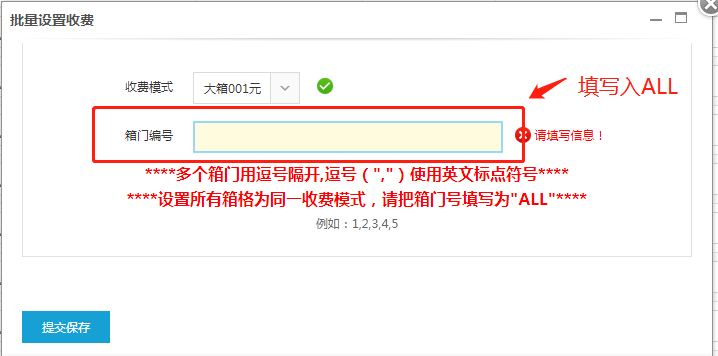 ○3 設(shè)置完之后“提交保存”即可(這里我們設(shè)置全部箱門收費模式為“大箱001