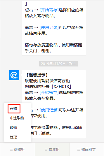 1)使用人在使用微信柜時,首次使用需打開微信掃一掃,掃屏幕二維碼碼關(guān)注公眾號,關(guān)注后進入公眾號內(nèi),點擊“存物”菜單(如圖1-1),掃碼選柜。