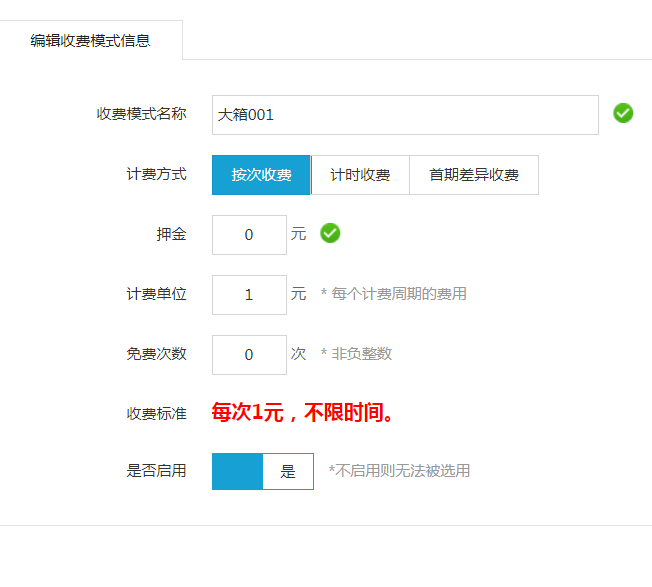 2) 這里我們以按次收費方式為例,設(shè)置收費模式參考如下: