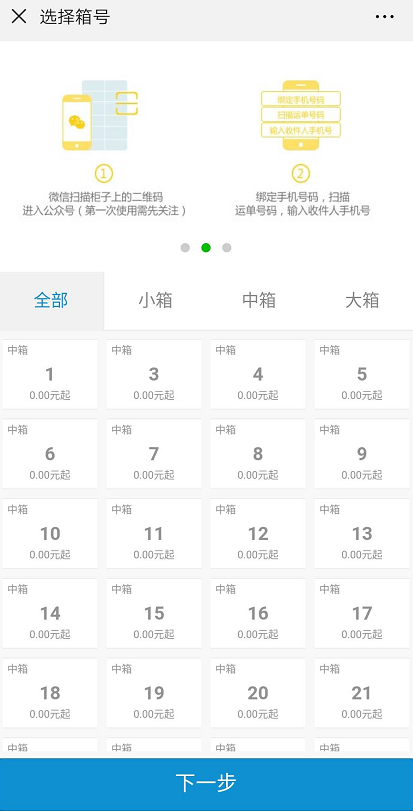2)點擊“存物”按鈕后,掃屏幕二維碼即可進入選箱界面(如圖1-2),選擇箱門號,點擊下一步,根據(jù)頁面提示并打開箱門,存入物品后請隨手關(guān)門。